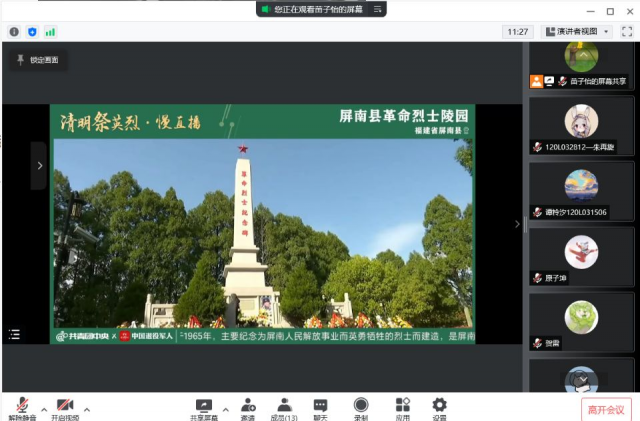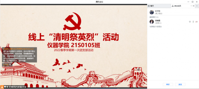 20S0101团支部曹子飞表示,我们在网上追思中华民族的英雄先烈,为“觉醒年代”的陈延年、“海空卫士”王伟、“戍边英雄”陈祥榕等英烈所在陵园“云端”献花。祖国是人民最坚实的依靠,英雄是民族最闪亮的坐标。他们为了捍卫国家领土,牺牲了自己的生命。我们应牢记历史,不忘英烈。在国家需要时,挺身而出。