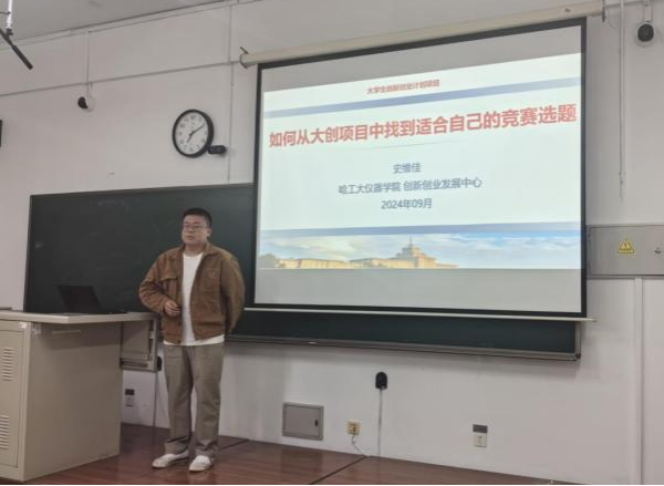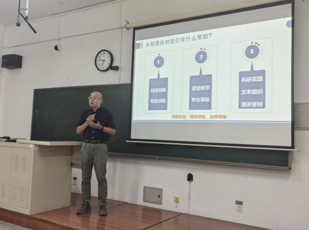 副院长叶东指出,“大创计划”是国家创新创业教育改革重要举措之一,鼓励同学们积极选择项目库内的项目,培养创新思维,激发创新热情,随后介绍了本年度的申报流程与时间安排。接下来,王启松老师细致讲解了大学生创新训练计划项目申报方案,指出大创项目对学生的“科技创新”“课堂教学”“科研实践”三方面的帮助,并介绍了大创项目的成果价值;最后介绍了学校首批本科综合设计(论文)重点项目,并对学生如何进行选题进行指导。史维佳老师对竞赛榜单内的竞赛进行了细致的讲解,指导同学们如何从大创项目中找到适合自己的竞赛选题;此外,他重点介绍了与仪器学科相关度高的大学生光电设计竞赛和传感器竞赛,鼓励同学们平时多注重积累,提前为竞赛打牢基础、做好准备。最后,球盟会 21级本科生曹志伟、未来技术球盟会22级本科生刘俊材分别分享了自己的大一年度项目经验和大创经验,以及获奖经历和竞赛心得。