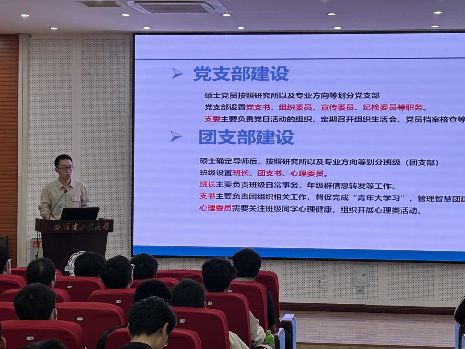兼职辅导员石剑老师就研究生日常事务体系、流程内容等具体工作进行了说明,并向新生介绍了校内常用信息。石老师鼓励同学们在科研之外,也要珍惜校园时光,培养多方面的兴趣爱好,提升综合素质,球盟会将提供一系列支持和服务,帮助同学们顺利度过研究生生涯的每一天。